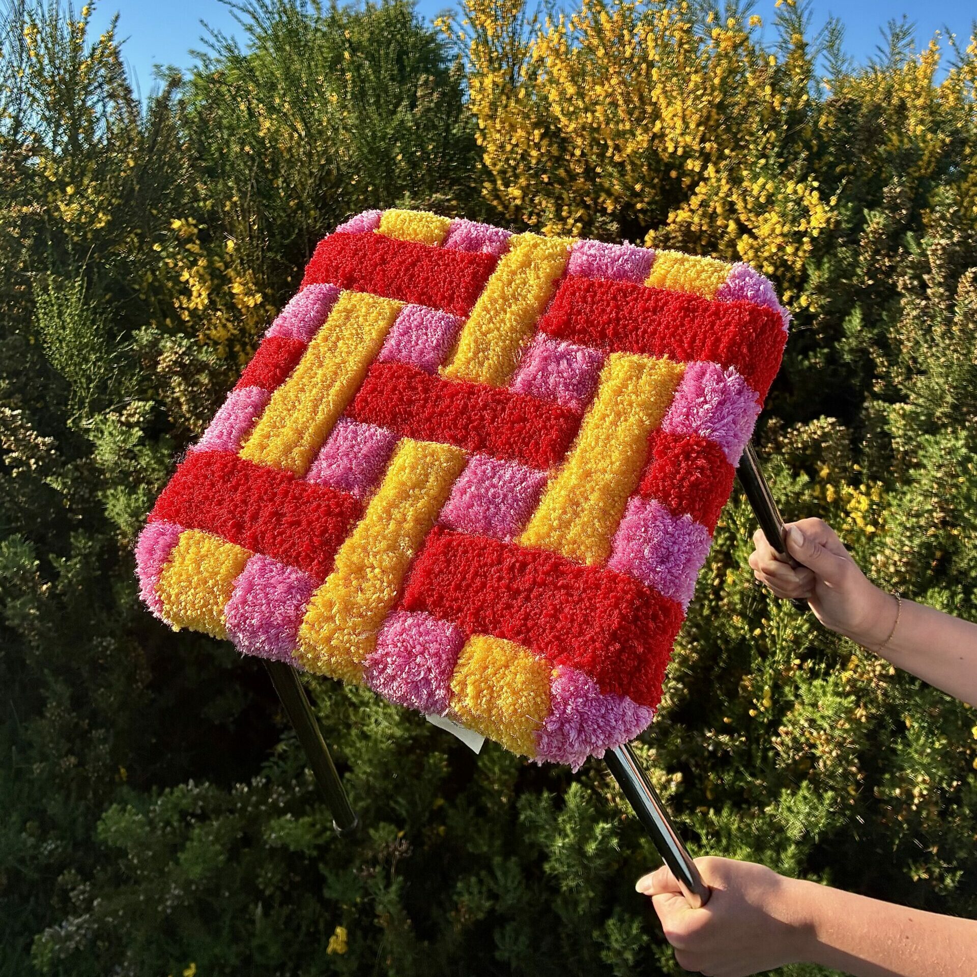 Composition : assise en laine acrylique, tabouret en acier acheté d’occasion dans le Cotentin.