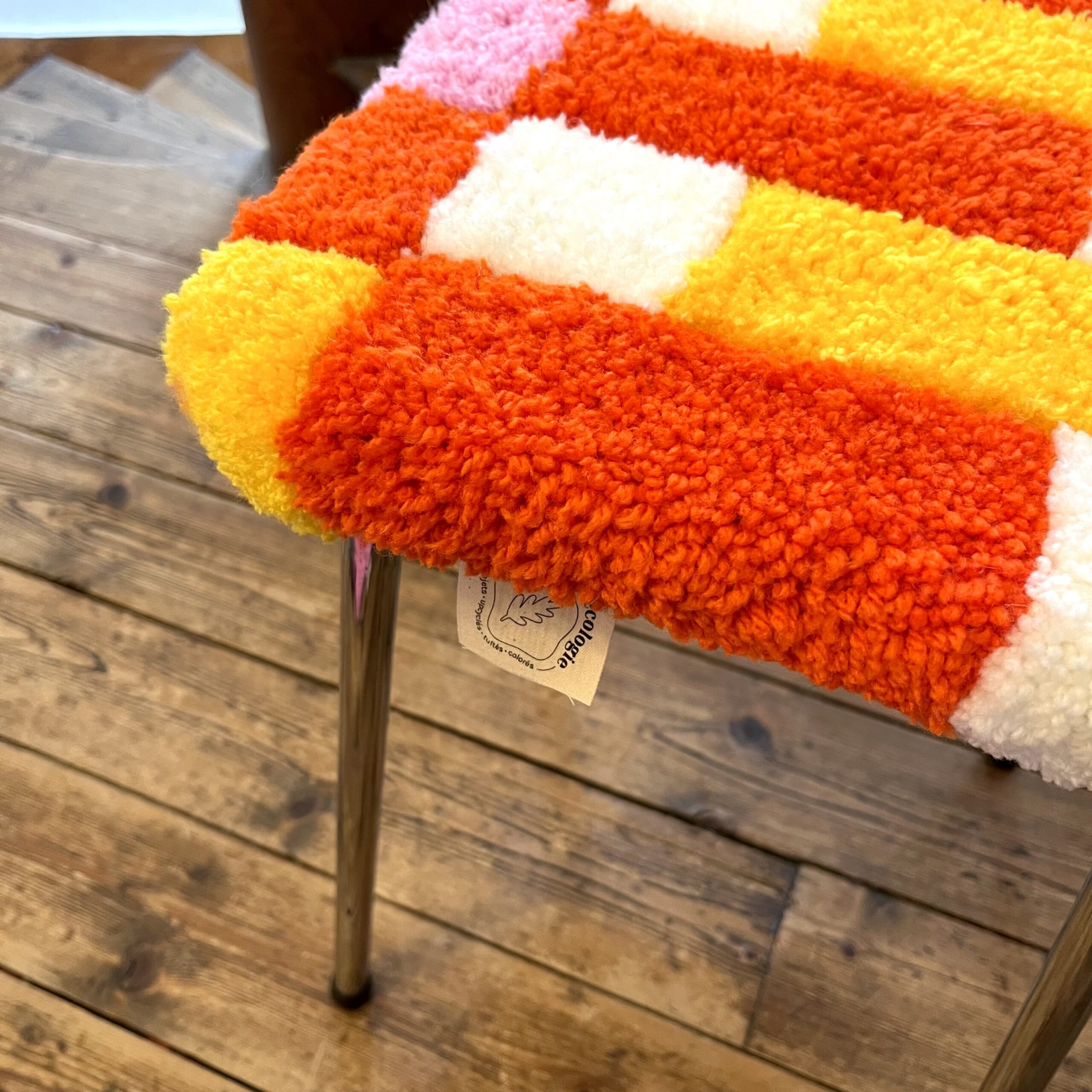 Composition : assise en laine acrylique, tabouret en acier acheté d’occasion dans le Cotentin.