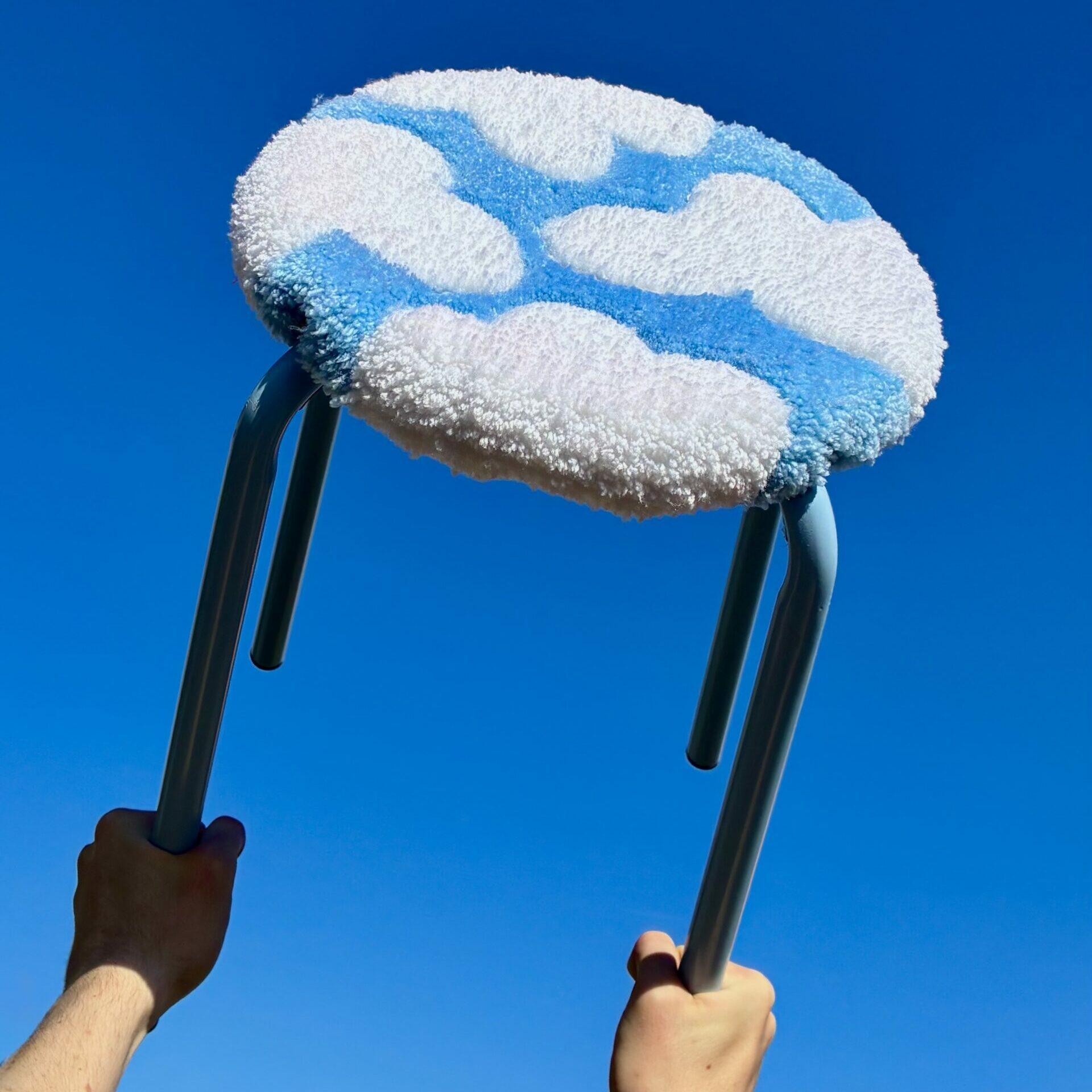 Composition : assise en laine acrylique, tabouret en acier acheté d’occasion.