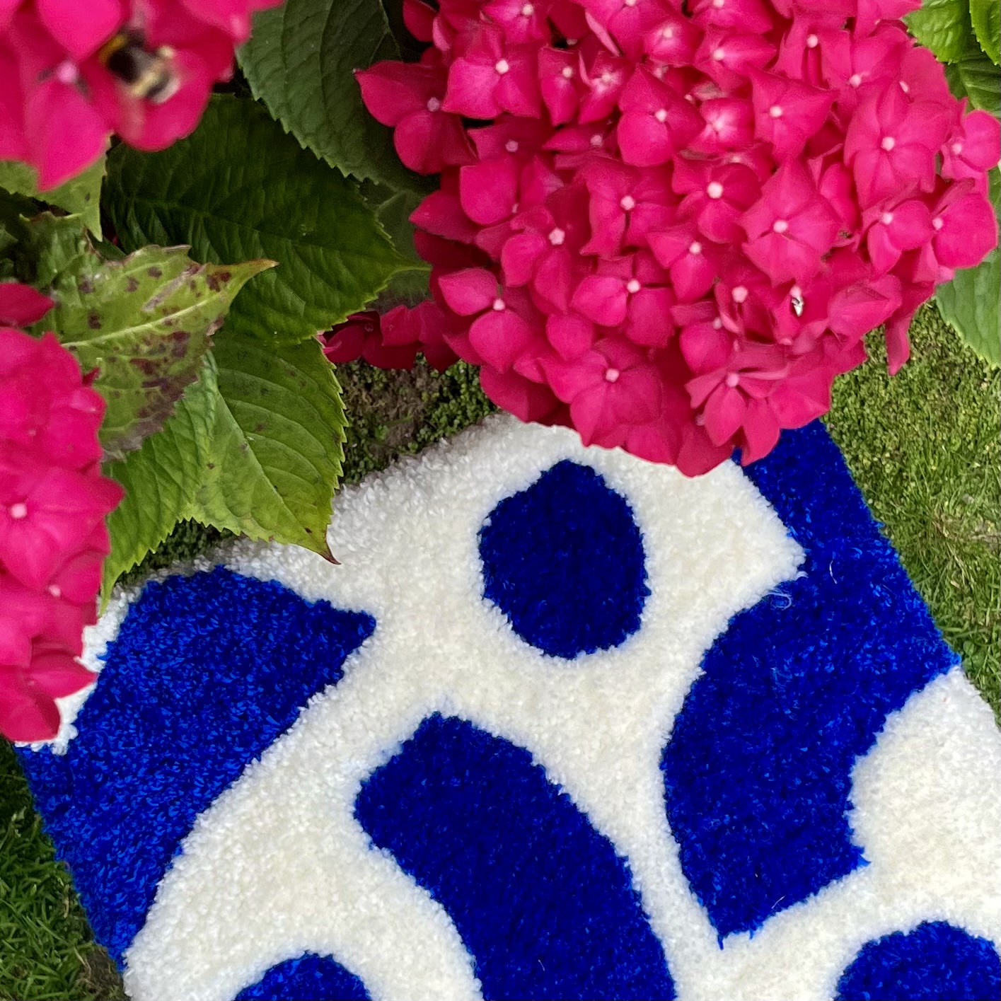 Composition : assise en laine acrylique, tabouret en acier acheté d’occasion.