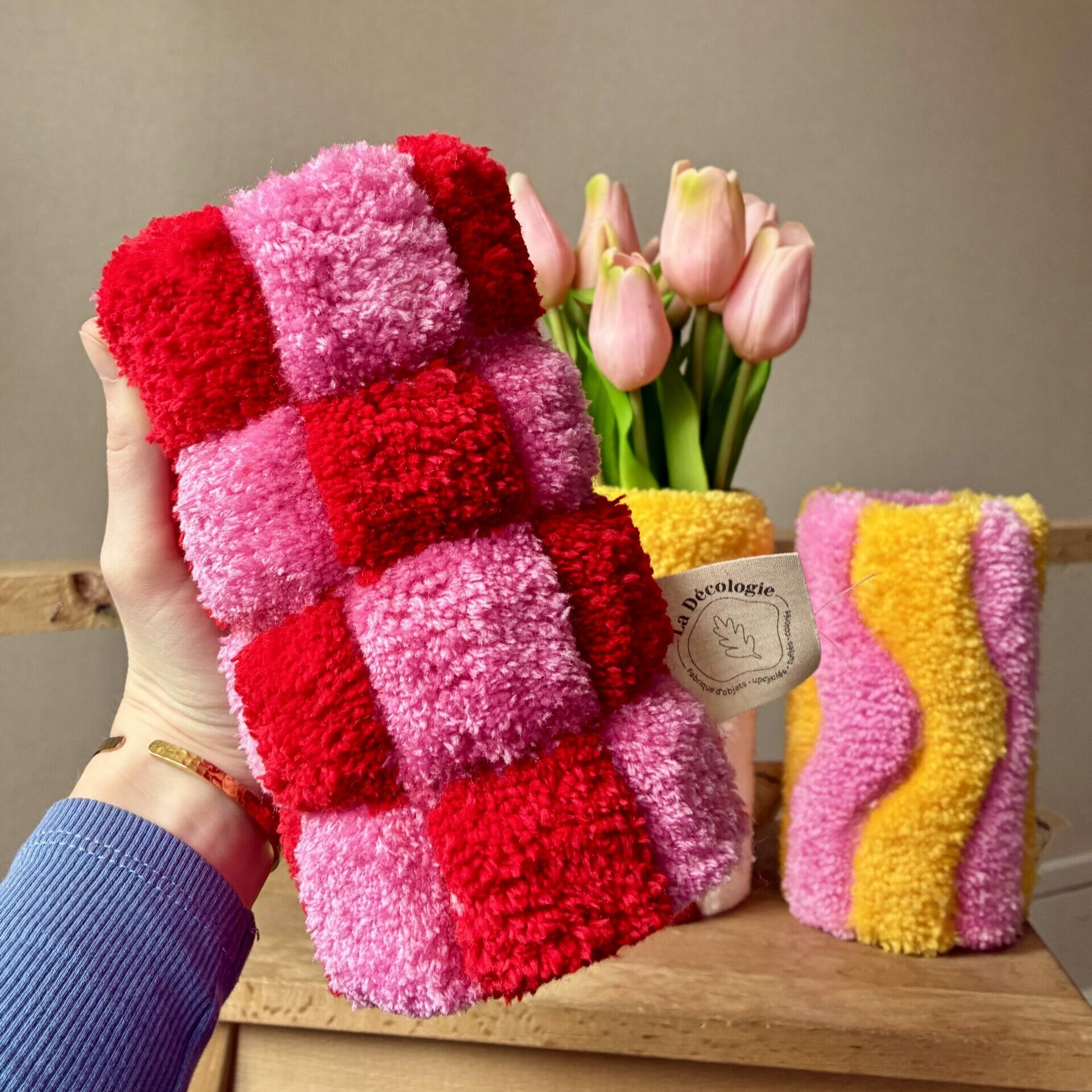 Vase damier réalisé à partir de bouteille en verre découpé.