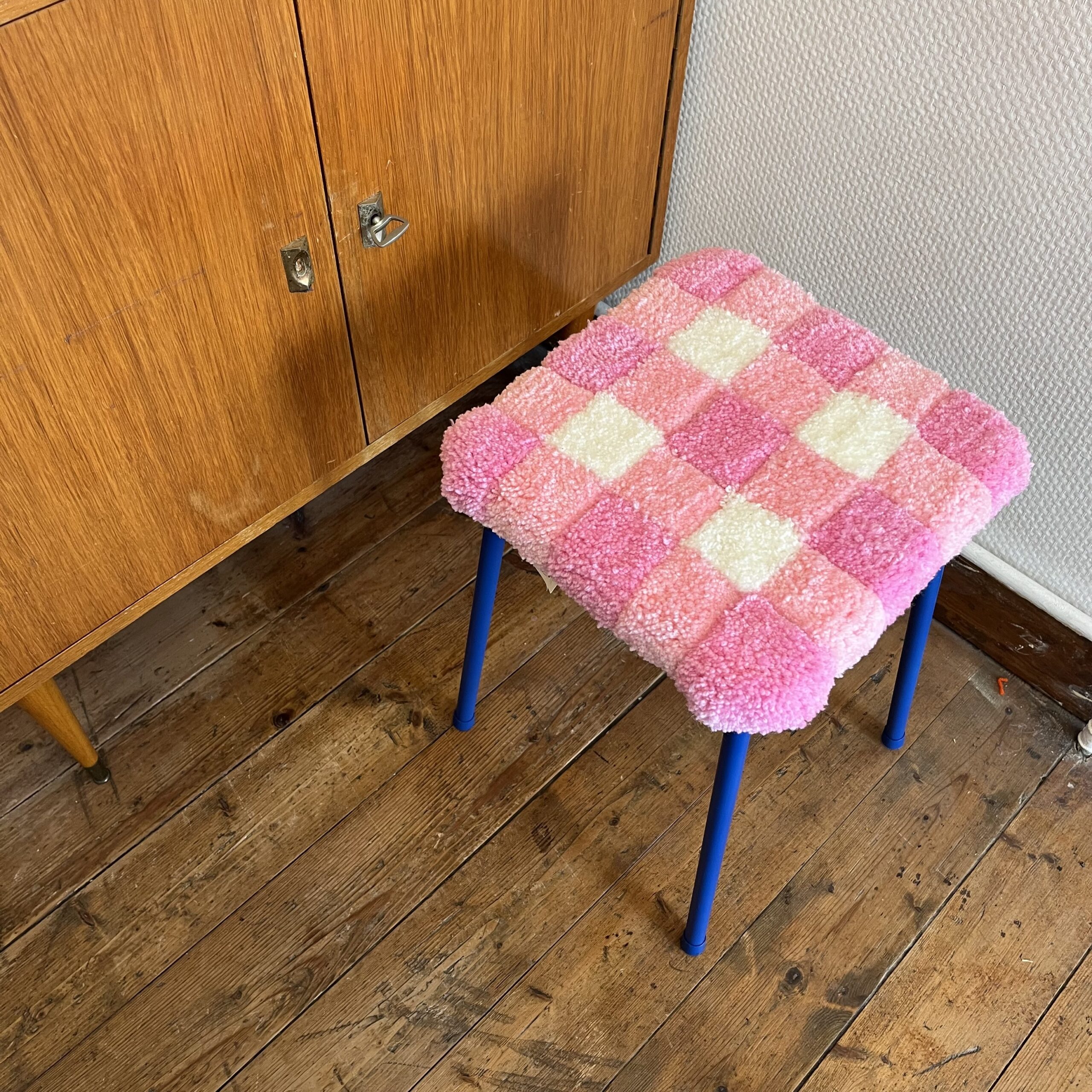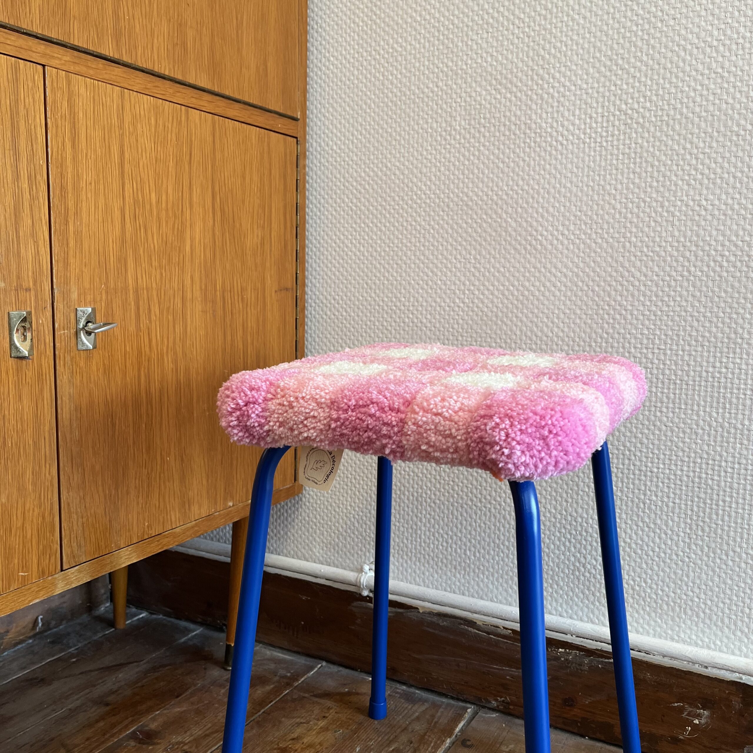 Composition : assise en laine acrylique, tabouret en acier acheté d’occasion dans le Cotentin, pieds peints en bleu roi.