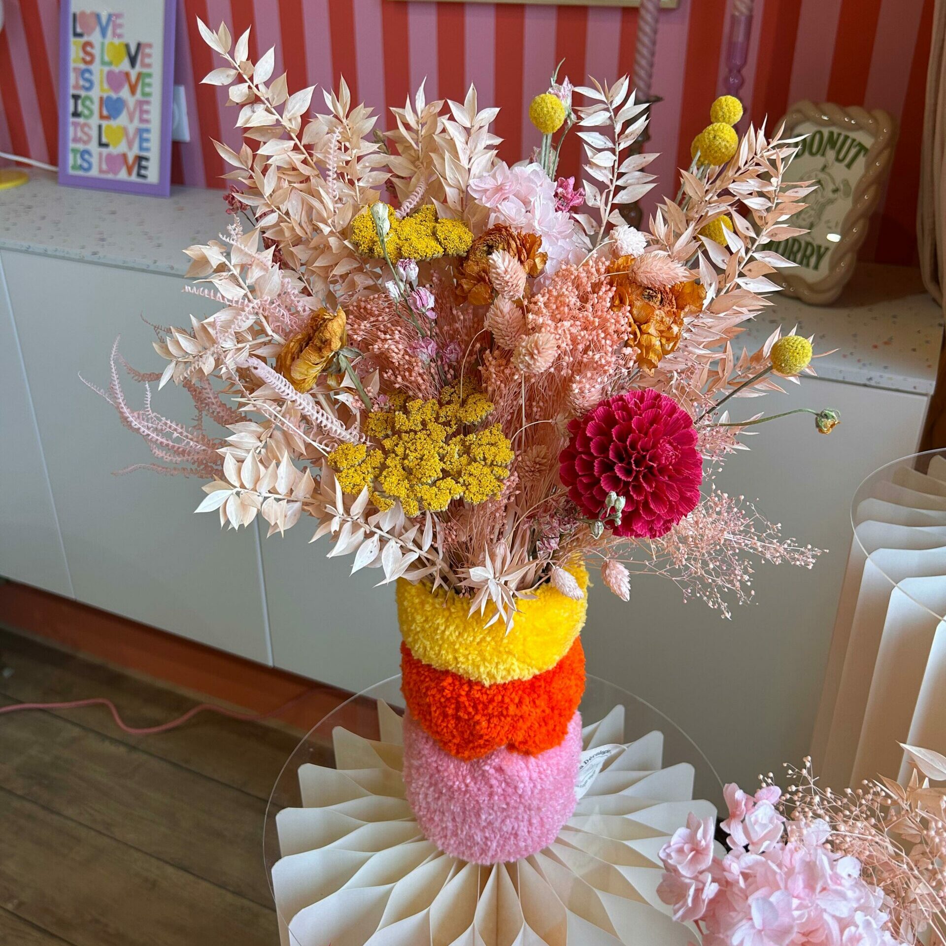 Vase en tufting réalisé à partir de bouteille en verre découpé.